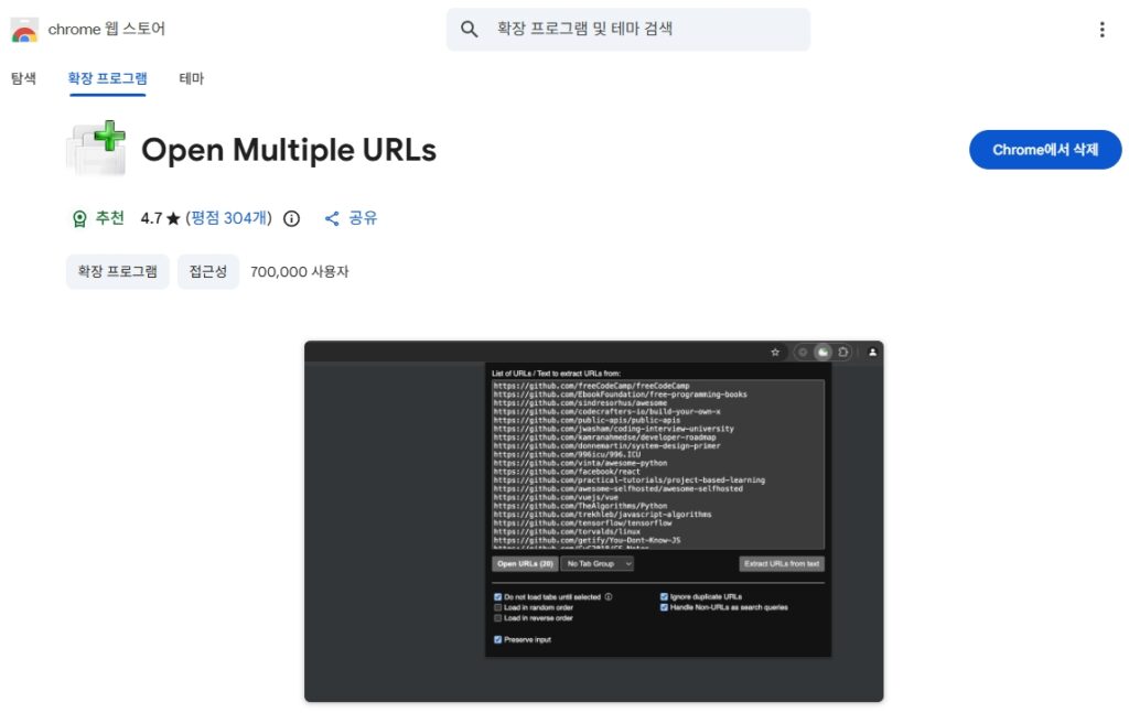 설치 링크로 들어가도 되고 Chrome 웹 스토어에 들어가서 Open Multiple URLs를 검색해도 됩니다.