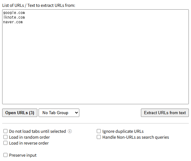이렇게 자주 들어가는 사이트들 목록을 적어놓고 Open URLs 버튼을 누르면 한번에 새탭들이 추가되며 여러 사이트들이 열립니다.