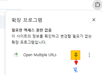 추가하고 나서 확장 프로그램 아이콘을 누르면 핀을 설정 할 수 있습니다. 저걸 한번 클릭해주면 고정이 되는데 고정을 하면